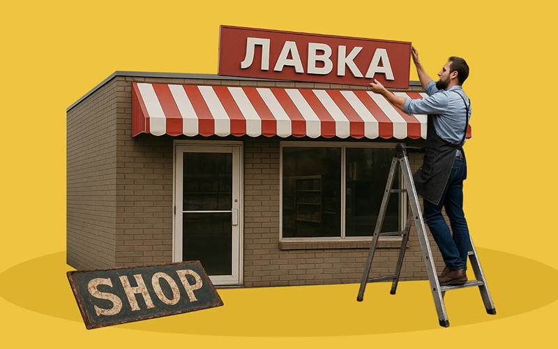Для рекламной вывески. Все данные о продукте или услуге, а также информация о компании, должны быть продублированы на русском языке. Важно, чтобы тип шрифта, цвет и размер не различались на двух и более языках.